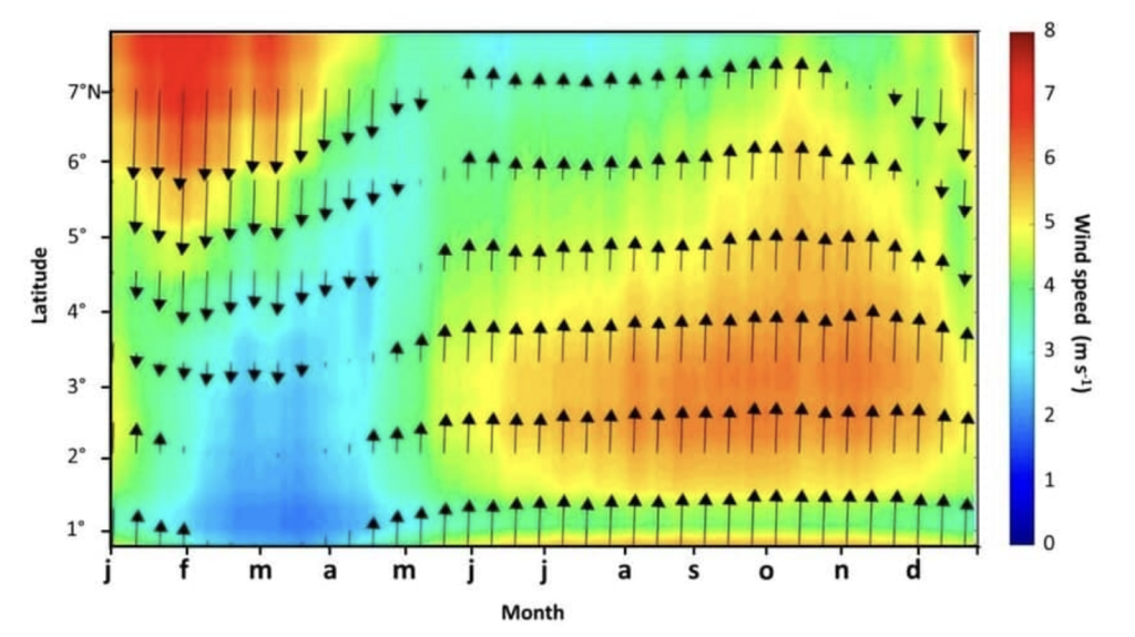 Annual cycle of the Panama Low-Level Jet (PLLJ) winds speeds calculated at PLLJmax. The arrows indicate the wind magnitude and direction at 10 m from the surface. (IFREMER-CERSAT data 1992-2018. Credit: Andres Ordonez).