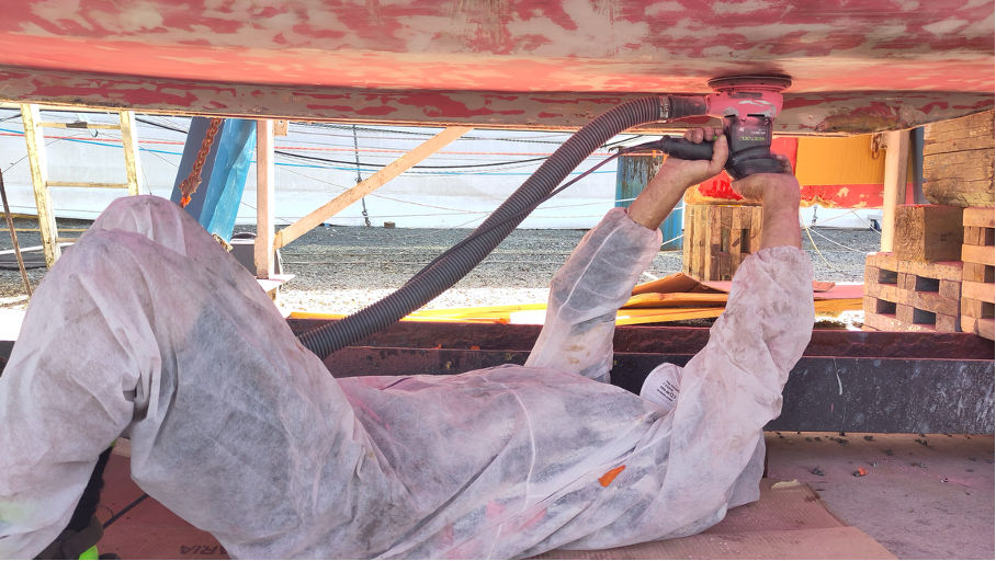 Here she goes, hauled out with the craneAnd then we go straight into the details, like here taking of the Autoprops. The hull still has the antifouling that the Biosecurity of New Zealand required. Here the hull and centerboard and rudderblades are fully sanded down to put the more durable coppper coat on it. By the way, do you see that part of a solar panel on the lift under side?All deck panels are taken off, to be replaced. Three of them were broken. The tropical sun is ruthless , the panel connections became to hot. The new ones will be CIGS, a complete different system and technology. It is cheaper and much promising. See the CIGS field test from 2023 .