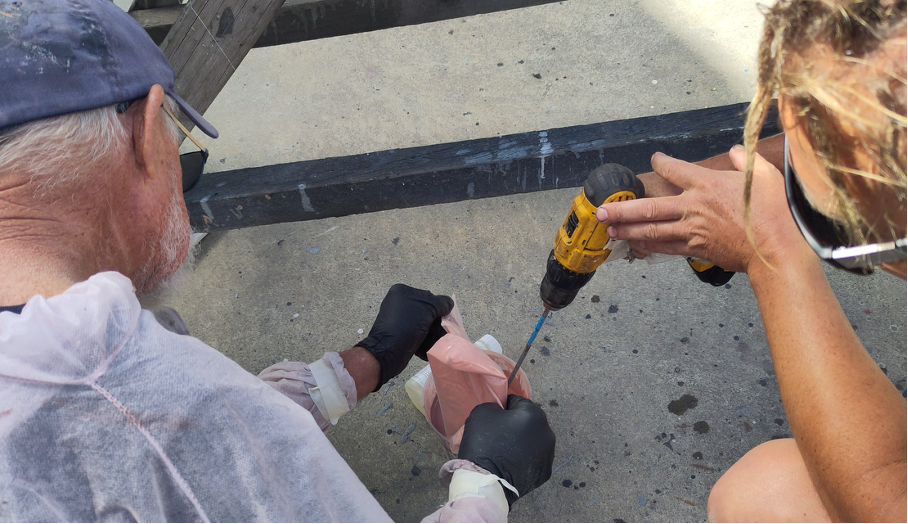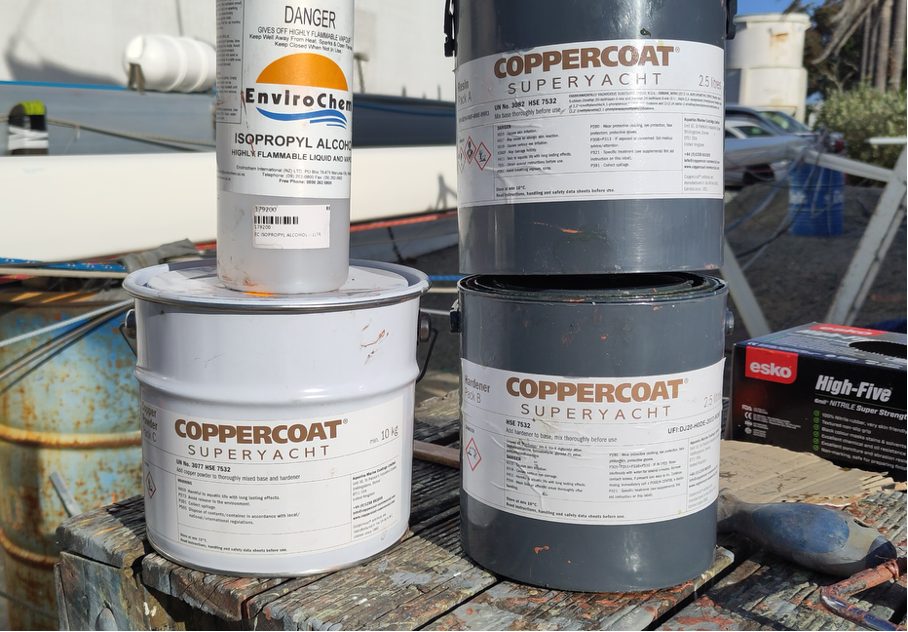 Dave sanded the bottom for days and daysand here he is painting the primer on it, just finishingThis is the resin (component A and B on the right) , the copper (left) and the special sort of thinner, ready for mixing.We started in the morning. Simon shows Dave how the mixing worksPeter and Bear (deep under the ship) are putting the layers of coppercoat on the hull, while Dave mixes, the whole day throughAt the end of the day we did all six layers. It is reasonably flat, so that is a good thing.