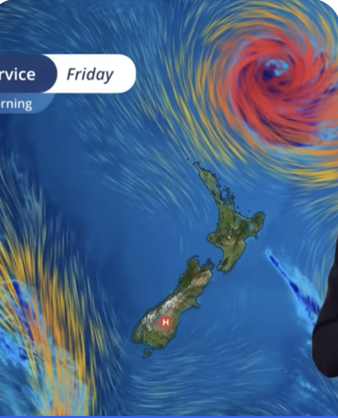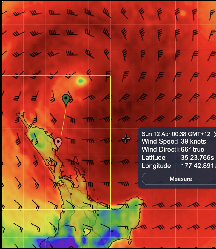 This curling mass of rain is a typical cyclone. This cyclone is called Vaianu and it travels with a speed of about 20 knots to the South. The red color means heavy rainfall. Here the winds are generally 50 knots, with gusts of about 80 knots. (resp. 95 and 150 km/hr). The more to the South, the colder the temperature of the sea so the lesser the winds. Vayanu becomes a tropical storm when it hits Ya in New Zealand.