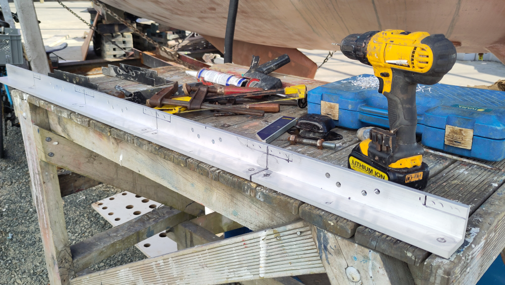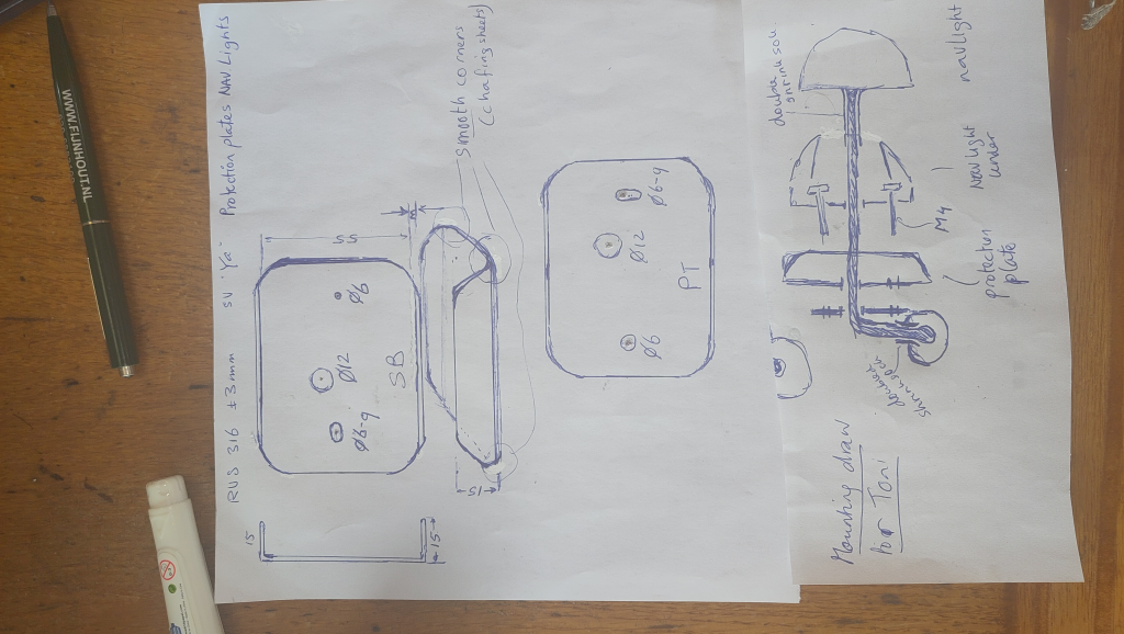 for each motor we change the two stainless steel supports for aluminium ones.The navigation lights must be renewed…..and that requires another support as well. here the drawingsall drilling in the stainless steel with a hand drill, is not easy and the drills breakmeanwhile Evan starts cleaning the windows the plasticizers from the fenders sticking to the windows