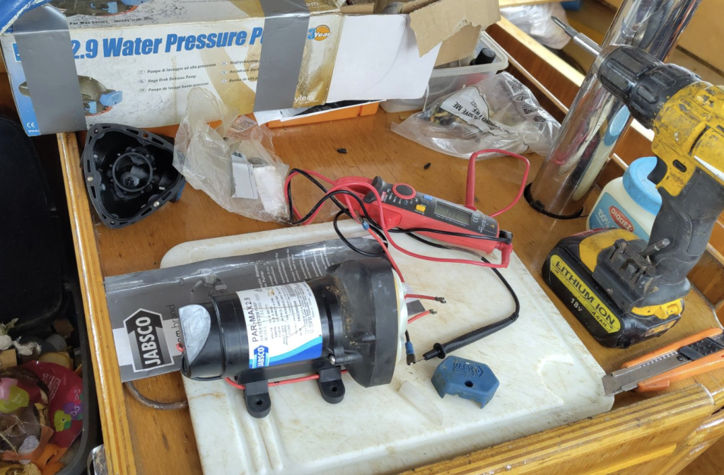 Found the leak. The connection between the valve and the through hull fitting leaks. It is a tiny bit, but it leaks. Most probably the stuff between the threads has dried out and shrunk in the last 5 months. Now it will get wet and expand again and most probably it will stop leaking. But Peter doesnot take the risk, suppose it will start leaking again under the constant motion of the seas. So Ya has to be out of the water next week for a quick repair. All of a sudden the drinking water tap stopped. Cause: the water pump stopped. Cause? Even Peter (former plumber) couldn’t discover it. So he took the pump out, took it apart completely, couldnot find anything, screwed everything back together, and… it worked again! Peter concluded: Miraculous, I have golden hands!